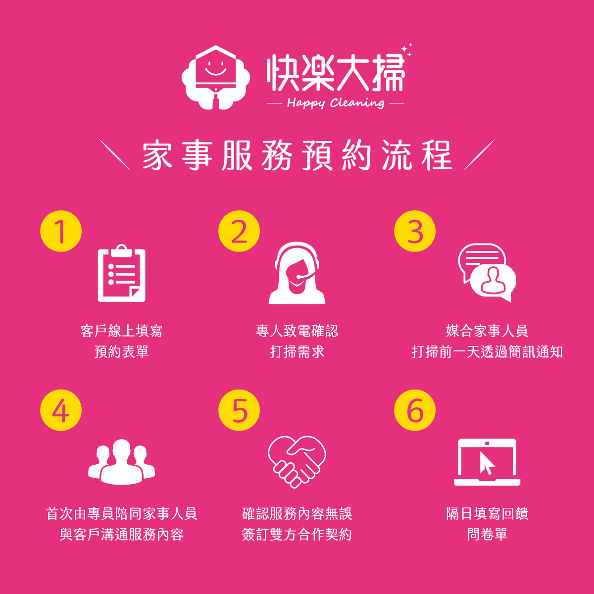 若您對我們的家事服務有任何疑問,歡迎參閱 常見問題 ,或透過以下方式與我們聯繫,將有專人為您服務。