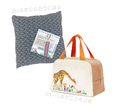 單筆捐款 10,000元以上,贈聯名「一起長大」晴雨傘 ★ 前1-2名,加碼贈泰雅圖騰抱枕 乙個(已贈完);第3-12名,加贈幾米限量「好友相伴餐袋」 乙個!