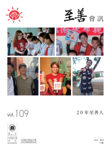 第109期會訊|20年至善人 2026-03-01 點選圖片觀看線上電子書 目錄 【至善心語】至善越南三十年 看見改變發生 【至善新聞】響應「國際人權日」至善基金會舉辦第三屆「校園族群友善獎」 【至善新聞】亞洲兒少的發展與挑戰 【至善新聞】希望的再生 【至善新聞】透過影像傳遞善的力量 【至善特輯】助人工作療癒了自己艱困的童年 【至善特輯】泰雅婦幼的守護者 【至善特輯】從被保護的小女孩到認養事務的穩定力量 【至善特輯】成為理想中的自己 【至善特輯】真實走進孩子心裡的那一刻 【至善友愛】被純粹的快樂治癒了 【至善友愛】磨劍與魔劍 【至善友愛】至善在越南以愛同行的三十年旅程 【至善友愛】愛在時光裏生長 【至善友愛】緬甸偏鄉重現幼兒學習生機