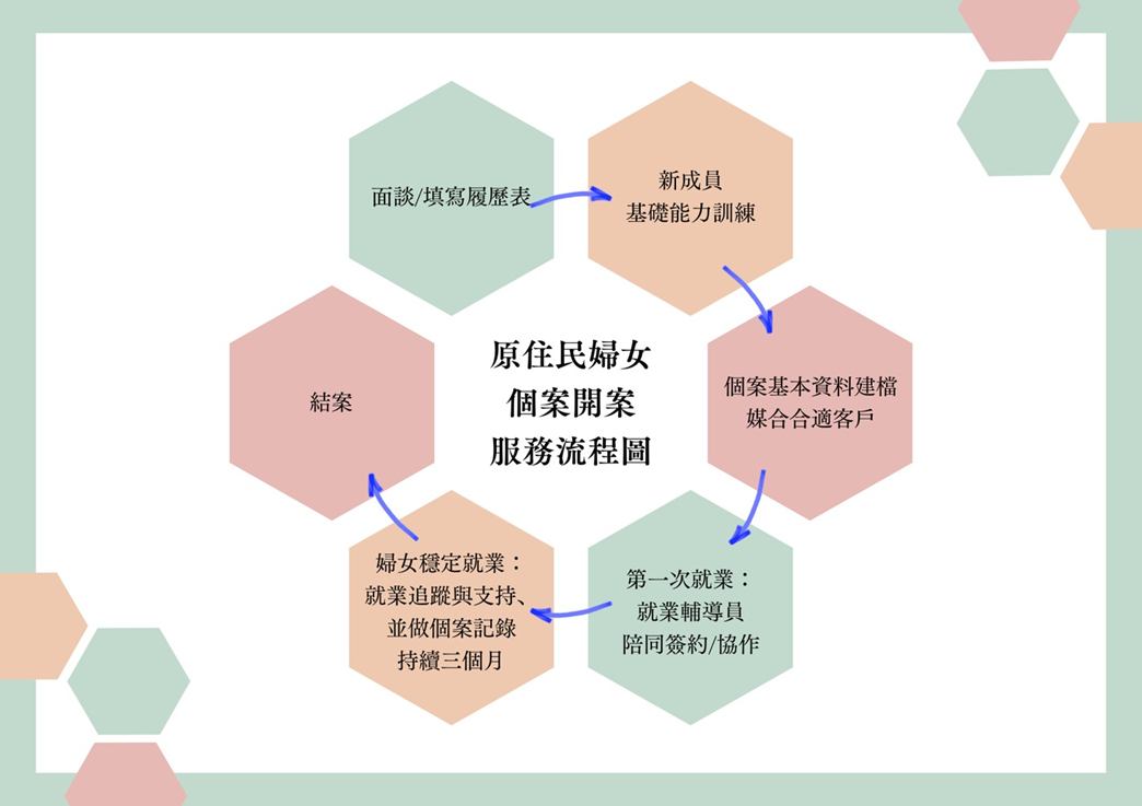 - 社會工作的陪伴與輔導機制:依據原住民婦女的文化與群體特性,設計多元彈性培力方案,協助婦女在生活與工作之間取得平衡,發展能兼顧家庭照顧與就業需求的自立支持系統。